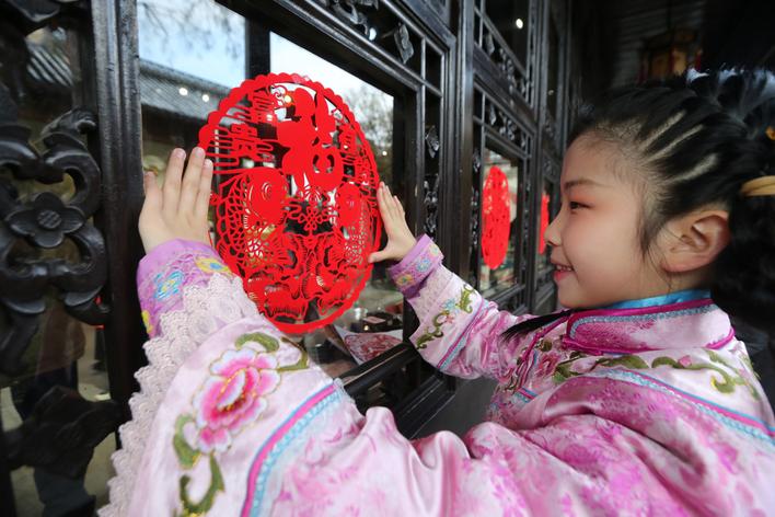 何园景区开展贴窗花迎新年活动。 孟德龙 摄