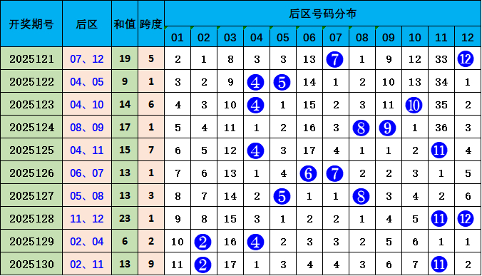 后区分析:上期后区开出02 11,跨度9,近十期跨度是:5、1、6、1、7、1、3、1、2、9,波动范围较大,跨度范围在1-9之间,本期预计跨度值不变,重点关注号码01 10,跨度9。